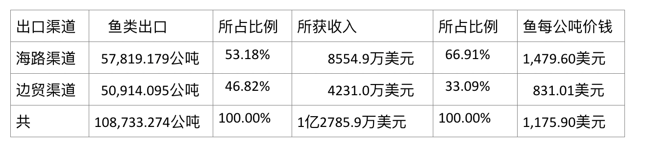 这样出口时,海路渠道出口与边贸出口两者相差不很大。但所获收入两者却差距甚大,海路出口收入约占全部出口的三分之二比例,边贸出口收入只占全部出口收入的三分之一比例。造成这样的原因,就是所获价钱不同所致。海路出口时,每公吨鱼类获1,479多美元,而由边贸出口时,每公吨价钱却只有831美元多。