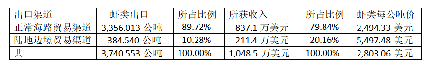 这样出口时,海路渠道出口占了较大的比例。边贸渠道出口的虾类重量只有总出口量的一成,但所获收入却占总收入的二成以上比例。造成这样的原因,就是所获价钱不同所致。海路出口时,每公吨虾所获价钱仅为2, 494多美元,而由边贸出口时,每公吨价钱却将近5,500美元。