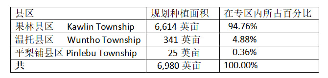 按:果林专区是实皆省内一农业种植地区,今年该专区就规划种植雨季稻199,850英亩,虽比不上伊洛瓦底省内的种植地区,但也属于有一定耕种能力的地区了。