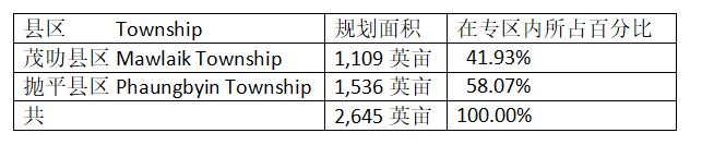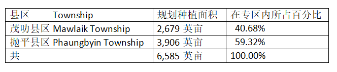在即将到来的2025—26财政年度冬作物种植季节期间,茂叻专区内的2个县区,茂叻县区及抛平(Phaungbyin)县区共规划种植这冬蔬菜作物6,585英亩,各县区规划的种植面积面积如下表: