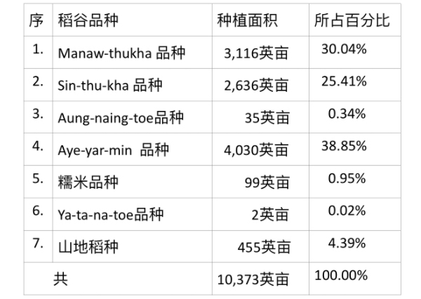 目前完成种植工作的稻谷,就以Aye-yar-min、Ma-naw-thu-kha及Sin-thu-kha等优质稻谷品种种植面积为最多,这三种品种稻谷种植面积就占全部稻田种植面积的九成以上比例了。