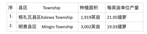 在过去的2024—25财政年度冬作物种植季节期间,格礼专区同样种植了黑麦豆豆这一作物,其中格礼瓦县区及明景县区种植的黑麦豆面积及单位产量如下表(见《缅华网》5月20日及5月26日“缅甸新闻”栏目中的有关报导):