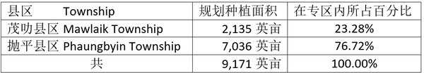 在即将到来的2025—26财政年度冬作物种植季节期间,茂叻专区内的2个县区,茂叻县区及抛平(Phaungbyin)县区共规划种植这肾豆作物9,171英亩,各县区规划的种植面积面积如下表: