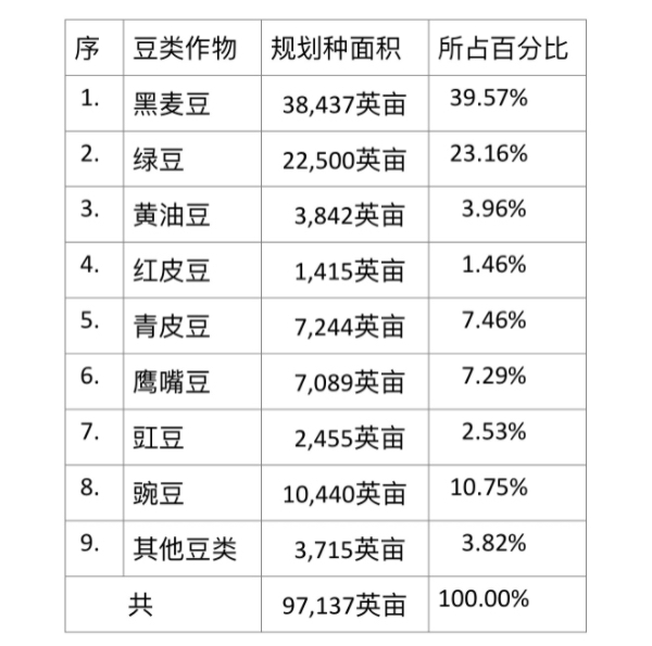 今年冬季甘布鲁县区规划种植的各种豆类种植面积面积如下表: