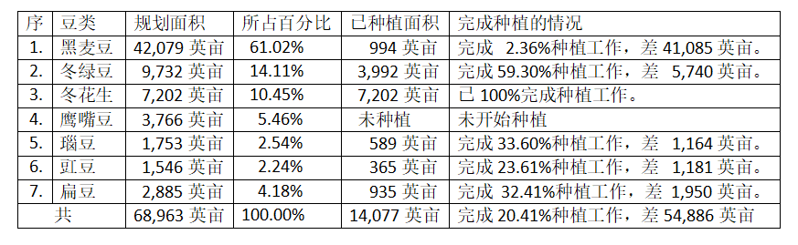 今年该县区规划种植 的豆类包括黑麦豆、绿豆、花生、鹰嘴豆、瑙豆(pe-naut,绿豆 的一种分支)、豇豆(bocade-pe)及扁豆(lablab-bean)等共68,963英亩。目前这些豆类已完成14,077英亩的种植工作,占规划种植面积20.41%的比例。