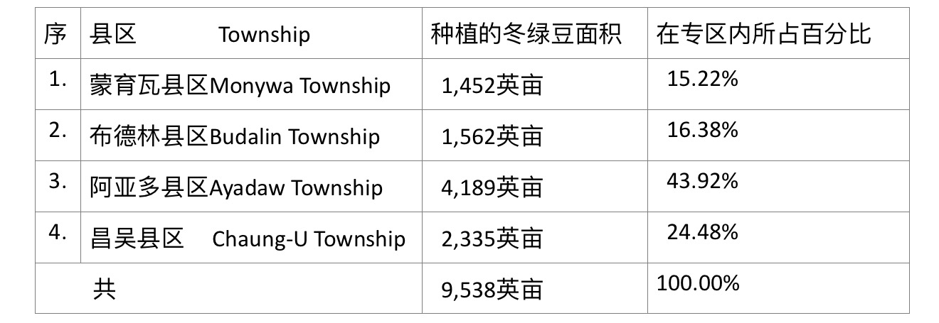 按:绿豆是缅甸三大出口豆类之一,过去此绿豆只作为冬作物在下缅甸地区种植,现在这绿豆种植工作已扩大到上缅甸阿仰(Ahnya)地区来种植了。阿亚多县区所在的蒙育瓦专区也广泛种植此绿豆,在2023—24财政年度冬作物种植季节期间全专区就种植了此绿豆9,538英亩,每英亩绿豆产量达到16缅箩,其中以阿亚多县区种植面积为最多(见《缅华网》2024年5月23日“缅甸新闻”栏目中的有关报导)。该专区各县区在2023年冬季期间种植的冬绿豆面积如下表: