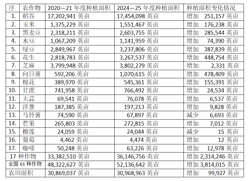 主要的17种农作物在2020—21年度及2024—25年度内种植面积分别如下: