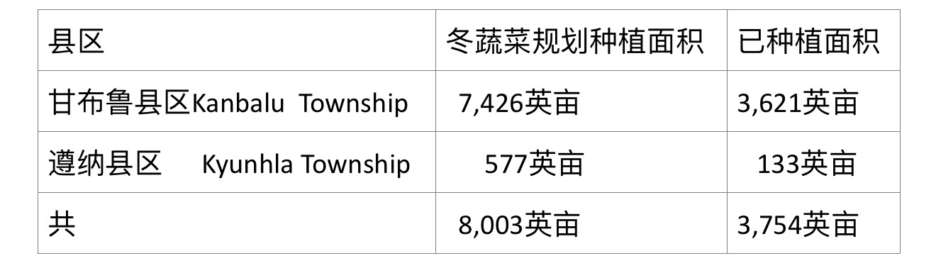 专区内的甘布鲁县区及遵纳(Kyun-hla)县区,在现在雨作物种植季节期间,规划种植8,003英亩冬蔬菜,当地农民们自今年10月开始种植这些冬蔬菜作物,到今天已种3,754英亩,完成规划种植面积的46.91%。
