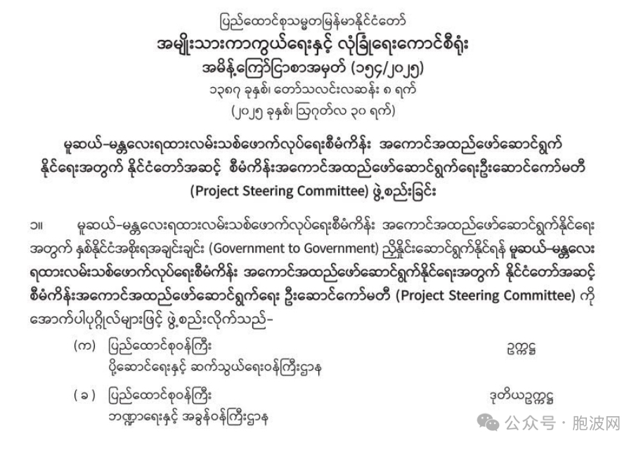 2025年11月30日仰光讯。由内比都的消息源获悉,2025年8月30日国家国防与安全委员会发布了154/2025号命令:“组建木姐-曼德勒铁路项目指导委员会PROJECT STEERING COMMITTEE。”该木姐-曼德勒铁路项目指导委员会由交通部联邦部长妙吞乌上将(ဗိုလ်ချုပ်ကြီးဟောင်းမြထွန်းဦး)为首的19人组成。@新时代媒体