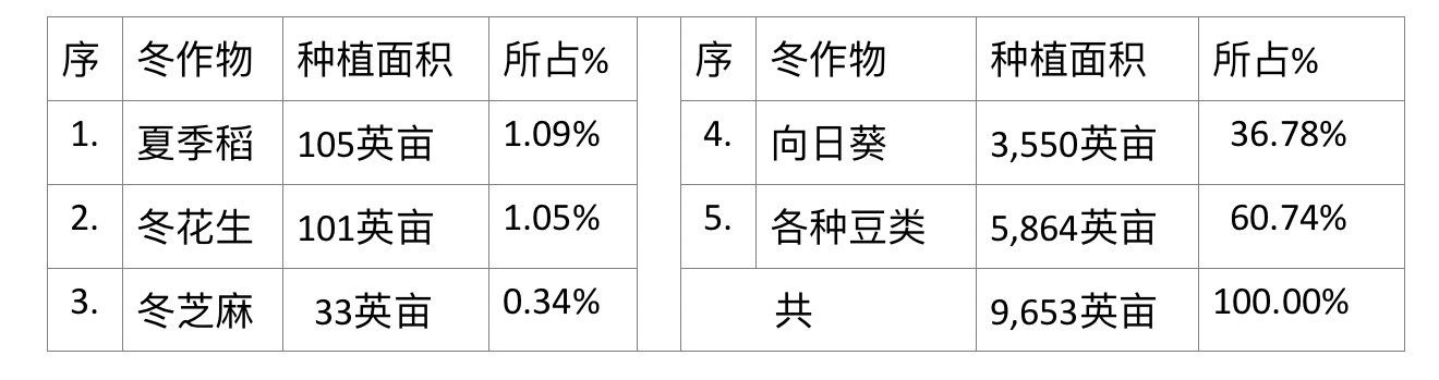 另外包括夏季稻及各种豆类的种植面积在内,现财年冬作物种植季节期间共种植了各种庄稼作物9,653英亩。各种作物目前完成的种植面积如下表: