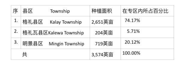 专区内的3个县区中,以格礼县区种植的冬洋葱面积为最多,几乎占全专区种植面积的 ¾ 比例,明景县区种植面积为全专区的五分之一。