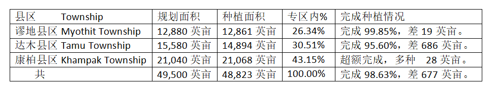 专区内的3个县区中,种植面积最多的是康柏县区,该县区目前完成的雨季稻种植面积占全专区的五分之二以上比例,而且目前县区完成的种植面积也超过规划面积了。