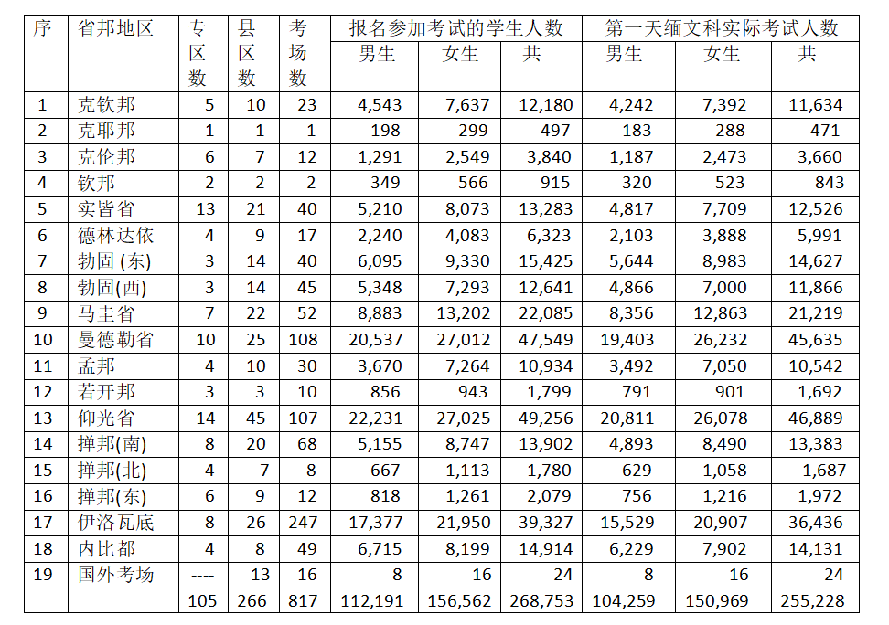 各省邦的高考报考人数,以仰光省人数为最多,达到4万9千多人;其次是曼德勒省,报考人数4万7千多人;位居第三的是伊洛瓦底省,报考人数3万9千多人,接近4万人。