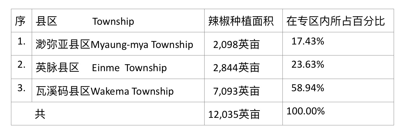 按:辣椒是一重要的厨房作物,在2024—25财政年度冬作物种植季节期间,渺弥亚专区内就曾种植辣椒作物12,035英亩(见《缅华网》2025年2月28日“缅甸新闻”栏目中的有关报导),当时专区内各县区种植的辣椒面积如下表:
