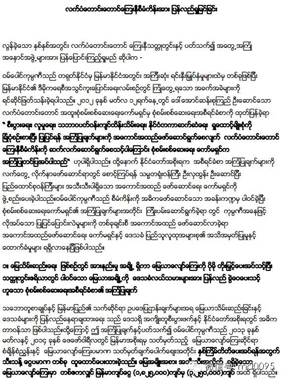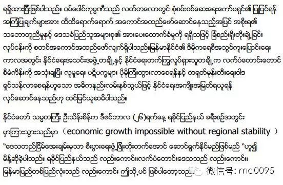 我还没完全仔细地对照三种文本看,但仅仅初略的看了一下,还是发现了三种文本中有不一致的地方,如中文文本最后一段“毋庸讳言,在缅甸民主转型的过程中,一些政治组织和激进分子将莱比塘项目作为索取政治利益的筹码,激化社会矛盾、煽动仇华情绪成为他们使用的主要伎俩,这种现象值得中缅两国政府高度警惕。”缅文文本有比较完整的翻译,但英文文本变成了“There is no doubt that, during the process of democratization of Myanmar, some political organizations and activists try to make political gains.”即省略掉了“激化社会矛盾、煽动仇华情绪成为他们使用的主要伎俩,这种现象值得中缅两国政府高度警惕”,实在不了解是何原因,还是翻译的遗漏,请仔细核对。这种政治上非常关键的文本怎么会有这种遗落?也不可能是英文版故意省略?