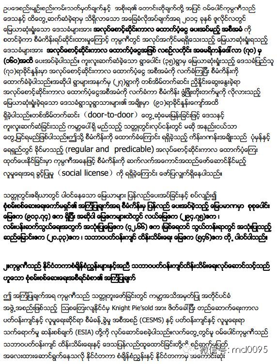 针对此建议,公司聘请澳大利亚著名的矿业咨询公司Knight Piesold制订了“建设期环境和社会管理计划(CESMS)”和“环境和社会影响评价(ESIA)”。事实上,万宝公司一直高度重视环境保护和社区帮扶,积极按照国际标准和国际良好实践进行项目建设开发。2013年10月11日,执行委员会通过CESMS,成为莱比塘项目建设期遵循的环境和社会管理指针,政府亦成立了国内外专家、主管部门官员及社区村民代表组成的独立监控团队(Independent Monitoring Team)对公司执行情况予以监督。2013年11月,ESIA初稿提交给缅甸政府官员和环保及社会问题专家组成的审查委员会,之后经过一系列的专家论证、社区沟通、澳大利亚同类型矿业项目实地调研等,并根据专家建议完成多处修改;2014年12月23日,ESIA通过缅甸国家环保委员会终审会,该委员会由环保部长任主席,成员有24位各部副部长及其他7位司局级官员共32人。