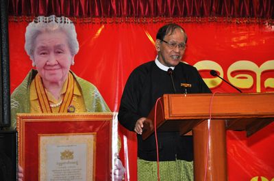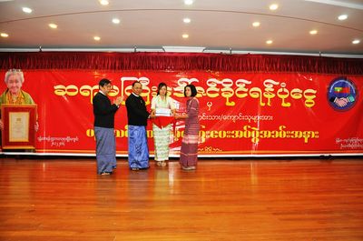 2014年12月28日下午5时,于曼德勒金多堰大雄宝殿大礼堂,举办粟秀玉基金会对缅北高考优秀生颁奖典礼。缅中友协总部主席盛温昂、曼德勒省社会与教育部部长温莱博士、中国驻曼德勒总领馆靳仪鳞副总领事、北京缅甸归侨联谊会主席粟秀玉、新华社驻缅记者张云飞、曼德勒缅中友协吴博敏为首的全体会员、曼德勒各华社侨领200余人出席了活动。