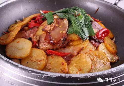 土豆250克、腊肉100克、青红辣椒、姜、蒜各适量。