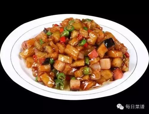 6、加入腊肉炒匀,放入茄丁翻炒;
