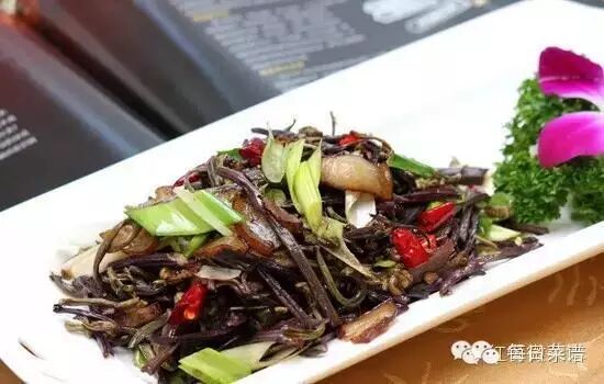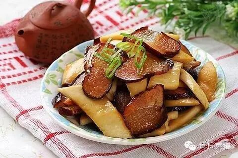 3、炒锅洗净放油,炒香腊肉,烹入料酒,加入葱、蒜、鲜汤焖2分钟;