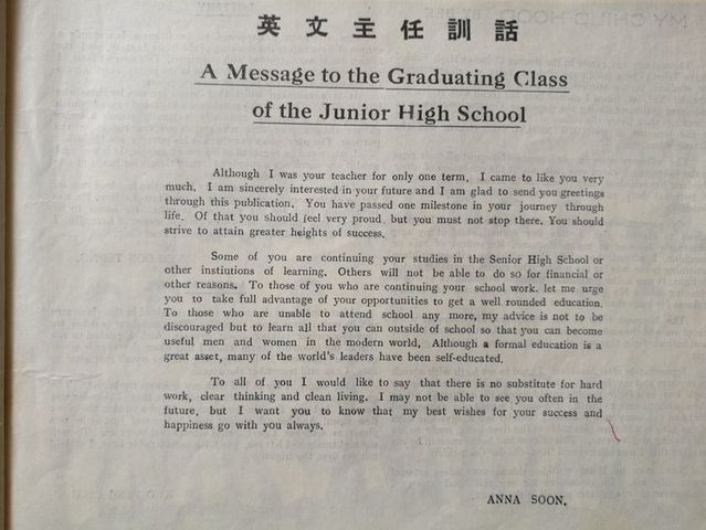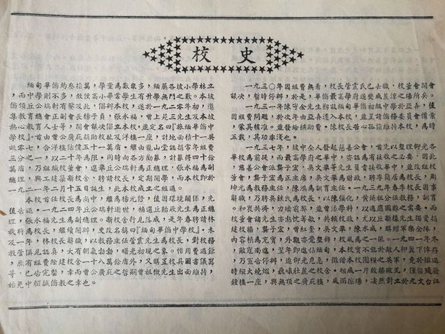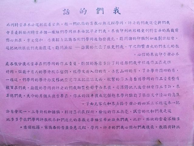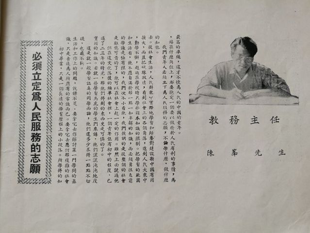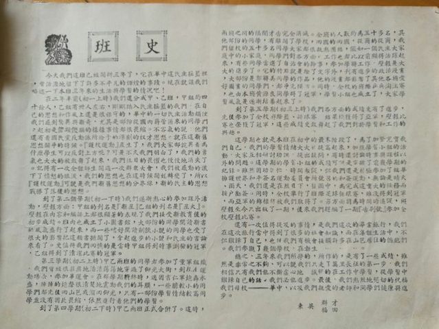 今天,我们在这班已经三年了,她在华中这民主摇篮里,曾留下了许多不平凡的成绩。现在就让我们 略述一下本班三年来的生活与学习的情况吧! 在二年半前(初一上)时我们还分成甲,乙班。甲组约四十余人,乙组卅人左右 。刚刚踏入民主摇篮的我们 ,在自已的思想和作风上还是很保守的。华中的民主活动颇使我们感到惊异与新奇。尤其是部份从国内蒋管区来的同学们,起初是儍头儍脑的样样都很畏缩。有着国民党反动派所给予的奴才思想。就在这新旧思想斗争的时候,[护校运动]产生了。我们大家都诧异着为什么学生可以反对校方呢? 可是,𣎴久我们明白后,我们的勇气也大大的被鼓舞起来,往日的畏惧也渐渐消失了。有一次全体师生开过一次群众大会,我们被感动得流下愤怒的眼泪,我们的思想从这个时候开始转变了。因此,[护校运动]可说是我们新旧思想的分界线,新民主思想战胜了落后的思想。……