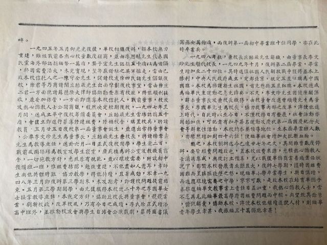 一九四五年五月仰光光复后,华校相继复办,独本校无力重建。虽经各热心前校董们磋商,并由李思辕先生代表国民党海外部认捐缅币一万盾,龚子宏先生认捐五千盾以首倡,终因需费浩大,未克实现。翌年底借驻之英军撤走,当由本校信托人之一的陈守金先生,促请校友徐四民诸先生倡议复校。徐君等乃商请丘贻厥先生出面擘划复校事宜。当由徐丘二君挽请苏德隆大律师协助勘查原有校址后,得以顺利接收,妥加保管 。同时邀集本校信托人,战前董事,校友及热心侨教人士公开 商议,决定尽快复校。一九四七年三月间,遂成立华中复校筹备委员会,丘贻厥先生 当场认捐五千盾,会后立即募集修建经费,修葺校舍,购置校具,聘请教员。五月二十五日复校第一届董事会诞生,并选出常务董事会,公举李文珍先生 为董事长,丘贻厥先生兼校长,聘请杨章熹先生为教导主任,遂于六月一日正式复校开学,学生逾二百。战前操场为教室及学生寝室,广庇楼为办公窒及教职员宿舍。一切施教方针,悉照原有规范,并以环境需要,附设初中预备班一班。帷经费拮据,勉强重建,不能尽如人意耳!幸师生尚能共体时艰,协力教学,得以持续,且着成效。不幸,于一九四八年三月即复办第三学期末,未及期考,即护校问题而提前结束。五月新学期开学,由先后服务本校二十年之李国华女士接掌教导主任,本既定方针协助丘校长与董事会,竞竞业业,刷新校政,改革校风,乃有今日之成绩。李氏除正式增添高中班外,并推动校友会与学生自治会公演戏剧,募得图书仪器基金万余盾。而复办第一届毕业班十位同学,亦在此时卒业矣。一九四八年秋,兼校长丘贻厥先生辞职,由董事长李文珍先生暂代校长。一九四九年十月,复办第二届毕业,毕业生增加至二十四位。其时适值祖国人民解放战争获得基本胜利,中央人民政府成立,定都北京,规定五星红旗为中国国旗。本校为维护新生祖国,首先悬挂五星红旗,遂使本校成为缅华民主运动之急先锋矣。不久,李文珍先生因健康问题,辞董事长及兼校长职务,校董会改选曾顺续先生为董事长,李国华先生为校长。极力从事内部之改革,俾使能追上时代。自此时以至今日,不仅校务日有发展,社会活动亦开始加强,记有和平签名运动及庆祝第一届国庆纪念大会等群众性活动,本校均忝属领导地位。至本届毕业班人数,骤然增至四十六位!为缅华社会增加大批新血轮。总之,本校创办迄今已廿七年之久,其间数度停办。皆因经费问题也!盖本校经费来源,悉赖热心侨教人士涓滴集成,无从订立预算,尤以战后华侨商业普遍萧条状况下,影响本校发展至巨且大,复办七学期,随时因经费困难而呈摇摇欲坠之势。现缅华小学卒业学生,与日俱增,而适应环境需要之中学,寥寥可数,是故本校在培育华侨子弟,推进缅华文教事业上责任日益加重,我热心侨教人士,当不忍再见此缅华最高学府因经费问题而中辍。尚望鼓其余勇,慷慨解囊,协助本校,俾使本校能继续造就人材,则缅华青年学生幸甚,我旅缅三十万侨胞幸甚!