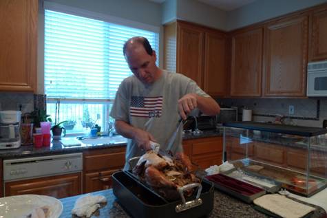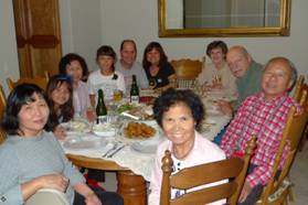 与往年一样, 我太太的大姪女, 邀请我们参加感恩节家庭火鸡晚宴。我们一到, 先品尝牛油果醬. 脆餅小吃。她家今年特地订购十五磅重肥大火鸡, 自己涂料烘焙。加上其他美味佳肴相配, 满桌酒菜,十分丰盛。当晚到宴的人, 有姪女母亲, 阿姨, 家公家婆, 我们夫妇及大儿子。姪女夫妇及两个九岁大双胞胎女儿, 热情款待。大家吃得津津有味。吃得最多的自然是香喷喷的火鸡切片, 加上红洒. 果汁。