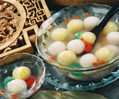 客人来了,坐在小矮凳上,搓着冰冷的双手就着小炭炉烤火,告诉牛伯伯想吃炒米粉汤圆。牛伯伯一边和客人闲话家常,一边干活,只见他双手利落的把粉团分成小块捏成薄片包入豆沙搓圆,放入滚水中,不一会汤圆就浮上来,他用笊篱捞起四五个滤去水份放入炒米粉的盘里,拿着盘子轻摇直到汤圆表面裹上了一层金黄色的炒米粉,用筷子夹入碗中,加入一匙浓浓的红糖浆。客人接过来咬一口,那炒米粉的香,汤圆的糯,豆沙的滑、糖浆的甜,和在一起的美味一入口,不禁满足的连声说“好吃!好吃!”无馅小汤圆则有各种吃法,你可以在小汤圆中加入红糖汤,吃它的原汁原味。也可以在小汤圆中加入一勺酒酿,打上一个鸡蛋。香甜的酒酿、半生熟的鸡蛋和小汤圆是绝配,一碗下肚,身体马上暖呼呼的,实在过瘾。