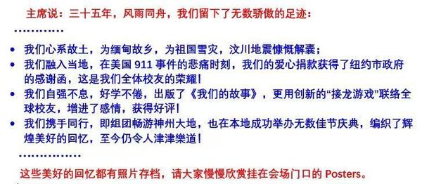 走进贵宾厅,眼见左边墙上呈现出一幅醒目的红底画轴,一张张照片,一段段历史……见证了三十五年来华友们的各种活动,和互动的瞬间,勾勒出校友们三十五年来点点滴滴的温馨回忆……。