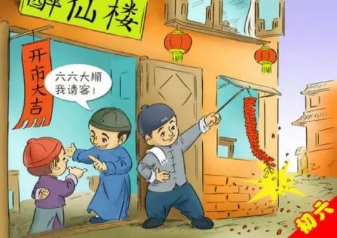 按照汉族习俗,初六是店铺大开张的日子,放鞭炮象征着今年的生意会红红火火,平平安安,大吉大利。旧时,老板和店员们会在这一天猛摇算盘,用秤杆敲打秤盘,让店内响声一片,取“响响当当,大吉大利”之意。