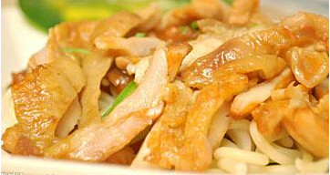 6、把腌制好的鸡放进铺好姜片,葱和鸡油的电饭锅,同时把腌制的调料也一起倒进去,在鸡身上淋一勺色拉油,插电,按下煮饭键,等到电饭锅跳起,过十分钟开锅,取出鸡,撕,吃的时候可以配上喜欢的蘸料,姜末,蒜末,姜汁,几滴生抽,一点点糖和多多的麻油拌在鸡上。 田园披萨