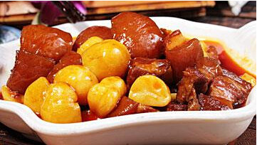 材料:400g板栗、500g带皮五花肉、适量冰糖、适量葱姜蒜、适量盐、1片桂皮、1个八角、3片香叶、15g色拉油、适量料酒