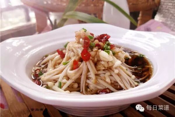 原料:金针菇、独蒜头、小米椒、盐、油、酱油、陈醋、香油