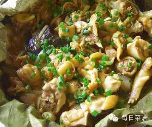 3. 将荷叶放上碟,将鸡、冬菇、火腿、姜、葱捞匀,用荷叶包好,置于蒸笼用大火蒸20分钟即可。