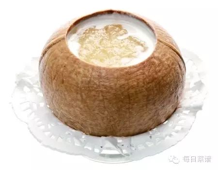 3. 将椰子盖锯开,倒出一些椰汁,再加入炖好的雪蛤膏和冰糖即可。