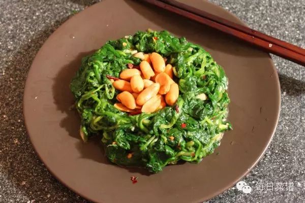 原料:菠菜、 花生、蒜、辣椒油、盐、糖、醋、蒸鱼豉油、香油