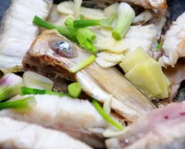 3 .烧热锅内3汤匙油,爆香姜丝、葱段和蒜蓉,放入巴浪鱼双面稍煎1分钟。