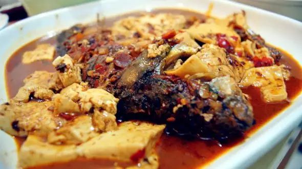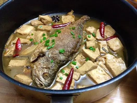 材料:黄鱼2条、豆腐200克、葱、姜、蒜适量、干红辣椒4-5根、淀粉少许、料酒、酱油、醋适量、盐、白糖少许。