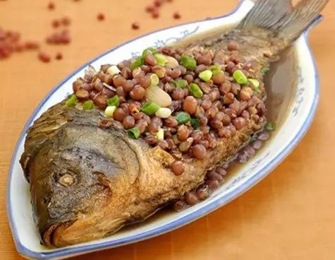 原料:鲤鱼1条、泡好的红小豆150克、油、生姜5片、蒜片、葱结1个、淀粉、陈醋、酱油、盐、料酒、葱花