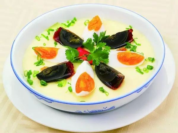 原料:皮蛋1个、生咸蛋黄2个、土鸡蛋2个、生姜1小块、盐1克。