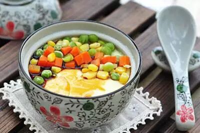 原料:土鸡蛋、彩蔬(胡萝卜粒、香菇粒、玉米粒、碗豆粒)。