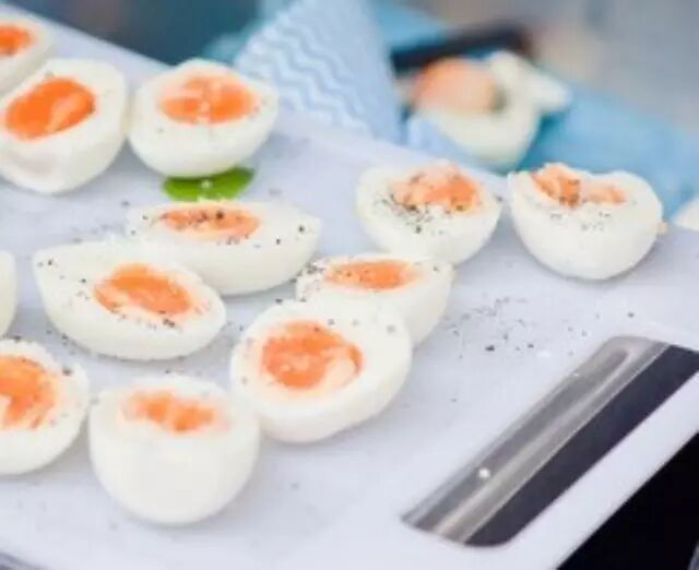 3、锅中水烧开,放入容器蒸至蛋白凝结;再倒入蛋黄蒸至凝结即可出锅;冷却后改刀装盘。