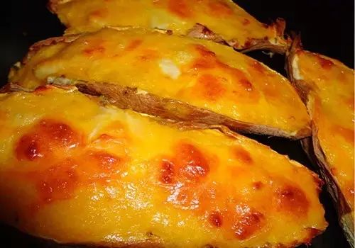 食材:红薯 (适量) 拉丝的芝士 (适量) 黄油 (适量) 白糖 (适量) 炼奶 (适量)