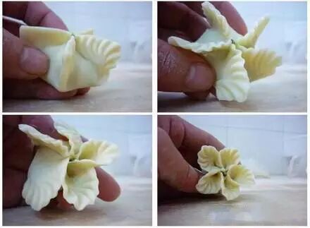 用拇指和食指捏出花边,形成5个叶片。把叶片底部向上拉起和相邻的叶子在中间相粘。