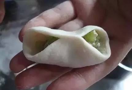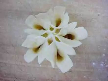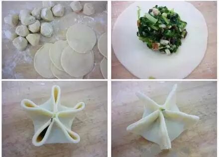 把面团搓条,下剂子擀皮,包入馅心。把圆皮均分5点,粘在一起形成5条边,把口捏紧。