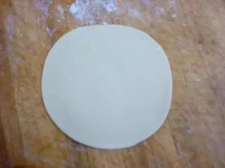 制作方法:面粉加入开水烫成面团,揉光搓条下剂子,擀成圆皮。