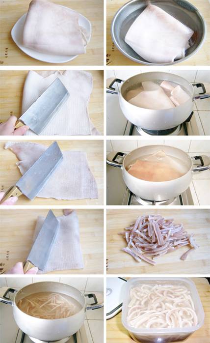 1.先将肉皮用清水浸泡二小时以上