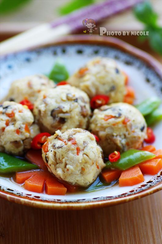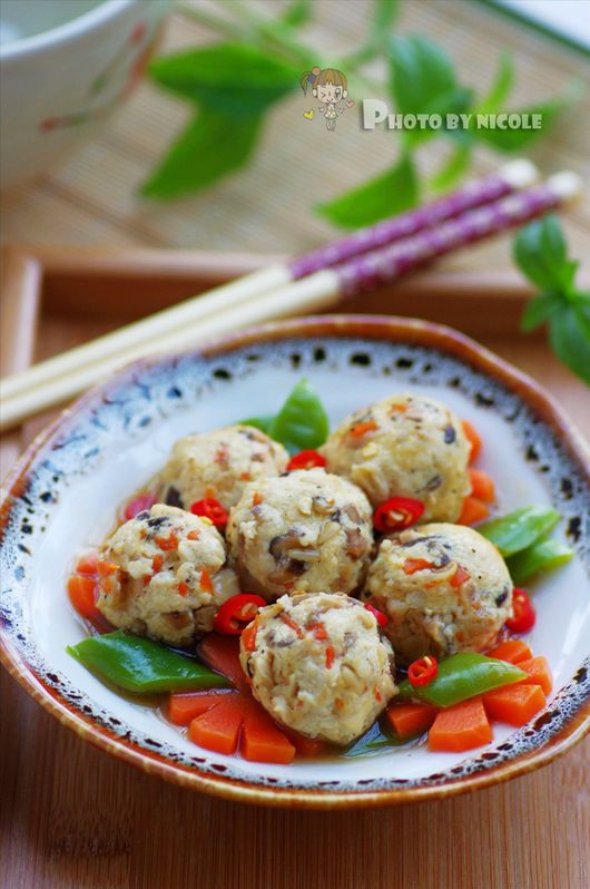 细腻软嫩的豆腐丸子,浸在时蔬汤汁中,软滑可口,鲜美程度丝毫不逊鱼丸。丸子中掺入了少许泡软的燕麦片,不仅为了健康,更为了细滑口感中偶然咀嚼到韧韧颗粒的那种味蕾感受,在我看来,当属点睛之笔…