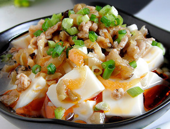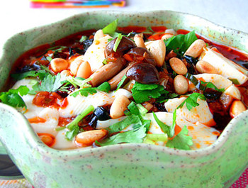 原料:嫩豆腐、葱姜蒜、蘑菇、胡萝卜、裙带菜、炒熟的松仁、芫荽