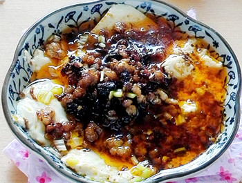 6.把炒好的香辣豆豉肉料浇在豆花上即可。
